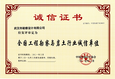 在公司領(lǐng)導(dǎo)和各部門的大力支持下,經(jīng)過公司生產(chǎn)經(jīng)營部精心的組織和認真準(zhǔn)備,我公司順利通過中國勘察設(shè)計協(xié)會的復(fù)審,順利成為湖北省首批獲得“全國工程與巖土行業(yè)誠信單位”的企業(yè)。
