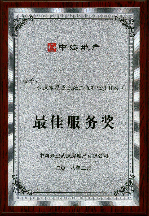 2018年3月27日,在中海地產(chǎn)武漢公司舉辦的“中海地產(chǎn)武漢供應(yīng)商大會”上,中海地產(chǎn)武漢公司為我司頒發(fā)了“中海地產(chǎn)最佳服務(wù)獎(jiǎng)”的獎(jiǎng)牌,基礎(chǔ)工程公司總經(jīng)理洪興全上臺領(lǐng)獎(jiǎng)。