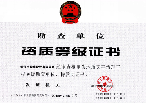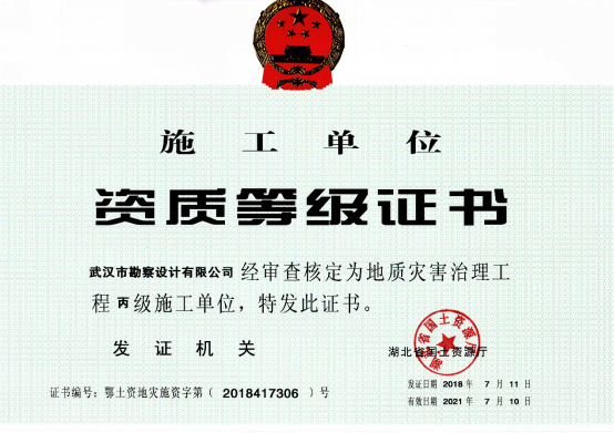 近日,湖北省國土資源廳發(fā)布了關(guān)于2018年度地質(zhì)災(zāi)害危險(xiǎn)性評估和治理工程資質(zhì)(新立、升級)審批結(jié)果的公告,公司地質(zhì)災(zāi)害危險(xiǎn)性評估和地質(zhì)災(zāi)害治理工程勘查、設(shè)計(jì)、施工資質(zhì)申請一次性順利通過國土資源部審核,并成功取得了資質(zhì)證書。